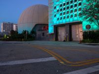 A view of Miami's cityscape at dawn, with modern architecture and neon lights illuminating the streets. The clear sky contrasts with the artificial blue light on a building, resembling a space station. A glimpse of Miami Beach in the background.