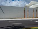 An aerial view of an empty street in Miami, Florida, lined with tall buildings and palm trees. Cloudy skies create a dramatic atmosphere, while the urban design and straight road profile add to the city's charm.