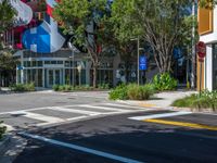 A vibrant city scene in Miami, Florida. Modern architecture creates a backdrop for the bustling urban life. Pedestrians cross the road near a stylish storefront. The traffic light casts a distinct shadow on the asphalt.