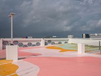 A gloomy day in Miami, Florida. The skateboard sits on the surface of a city building with a painted sidewalk and walkway. Grey skies loom overhead, adding to the urban aesthetics of this open space in the heart of Miami Beach.