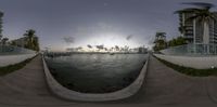 two fisheye views of a body of water with some buildings in the background at sunset