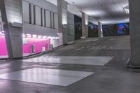 A night shot of a parking deck in Miami, Florida. The concrete structure features architectural lines and artificial lighting. The entrance ramp leads to a dark concrete street.