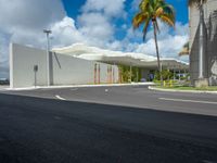 a road near a building with palm trees and clouds in the background is a white building that has a curved roof that wraps across from a small courtyard