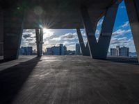 A sunny day in Miami, Florida with a clear sky and a view of the city's skyline. Skyscrapers rise above the concrete surfaces of the cityscape. An open parking lot provides ample space. Enjoy the urban sunshine.
