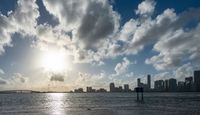 a sunset that is shining over a river and a large city in the background with a few boats