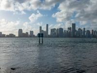 a view of the city with water, with a person on it, in the foreground of a view of downtown