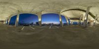 Sunset in Miami, Florida. Fisheye lens captures the architectural beauty of a building with arched columns. The urban skyline and skyscrapers are visible against a colorful sky. The straight road leads to a parking lot, creating an open space with hard shadows.