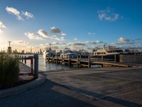 several boats sit docked at a marina during a beautiful day in the city on the water