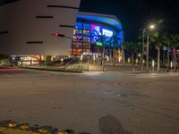 This is an image of an outside mall in Miami Beach, Florida, USA. The photo was taken at night, showing the artificial light illuminating the urban landscape. Cars can be seen coming in and out of the mall, while the road and street lights create a sense of activity and movement. The cloudy sky contrasts with the dark surroundings, adding an atmospheric touch to the scene. This photo represents the vibrant city life of Miami Beach at night.