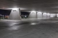 the interior of a large parking garage at night time, looking down at its ramp and light source