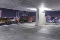 This is an image taken at night in Miami, Florida. The photo showcases the architecture of a city building with open spaces and concrete surfaces. The artificial light illuminates the parking lot, highlighting the floor and ceiling of the parking deck. The dark surroundings create a dramatic ambiance. This image captures the urban atmosphere of Miami at night, with the stadium and other structures adding to the overall cityscape.