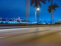 This image captures the vibrant city life of Miami Beach, Florida, USA. The dark and gloomy night scene is illuminated by street lights and artificial light from the skyline. Cars can be seen driving along the road, creating a motion blur effect. Tall palm trees stand in the foreground, adding to the urban design of the cityscape. The grey sky sets the atmosphere for this nocturnal scene. This photo is a representation of the energetic and lively nightlife in Miami Beach.