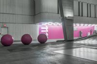 four giant pink ball statues in front of a metal structure in an indoor mall or garage