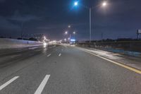 This is a nighttime image of a straight road in Miami, Florida, USA. The road, made of asphalt, is illuminated by streetlights and other lights from the urban infrastructure. The straight road leads into the distance, lined with lanes and an Armco barrier. The dark sky contrasts with the bright lights, creating a mesmerizing atmosphere. This photo captures the urban cityscape and the vibrant nightlife of Miami.
