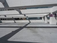 a parking garage with multiple benches and street signs next to buildings along the sidewalk and skylights