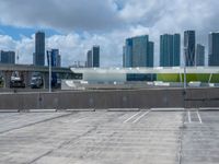 This aerial photo captures the urban landscape of Miami, Florida, USA. The clear sky provides a striking backdrop for the city skyline, featuring high-rise buildings and the iconic Miami Beach. In the foreground, a parking lot showcases the carefully planned urban design, with well-defined parking spaces on the asphalt surface. This image represents a typical day in Miami, where the modern cityscape blends with the natural beauty of the surrounding area.