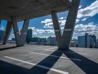 This image captures a skateboarder performing tricks in a sunny Miami parking garage. The skateboarder is seen against the backdrop of the city skyline, dominated by skyscrapers. The hard shadows create a dynamic contrast on the concrete surface. The urban atmosphere is further emphasized by the presence of parked cars in the parking lot. This photo represents the vibrant and energetic city of Miami, known for its beautiful skyline and urban culture.
