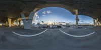 A unique perspective of Miami's skyline captured through the fish-eye view mirror. The low sun casts hard shadows on the concrete surfaces, revealing the urban design of the city. The clouds in the distance add a touch of drama to the sunny day.