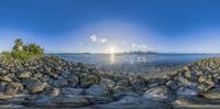 A stunning 360-degree view of Miami Beach, Florida. The city skyline and skyscrapers reflect in the calm lake, creating a captivating urban design. The coastal city comes alive at night with dark skies, while the ocean sparkles under the sunny sun.