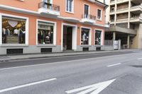 A vibrant street in Milan, Italy, lined with shops and storefronts. White lines mark the three-lane road leading to the sidewalk. Balconies and facades add to the charm of this bustling city scene.