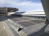 This image captures the modern architecture and urban design of downtown Milwaukee, Wisconsin in the USA. A person is seen walking up steps in front of a futuristic office building, with a walkway and stairs leading to the entrance. The high-rise buildings in the business district create a line against the clear sky dotted with clouds. The open spaces and elevated walkways showcase the city's urban infrastructure. The museum and other tourist attractions are also visible in the background. This photo represents the vibrant and dynamic atmosphere of Milwaukee's business and cultural hub.