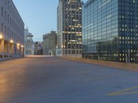 A dark night in the city of Milwaukee, Wisconsin. The empty parking lot in front of a high-rise building is illuminated by artificial light. The urban skyline and downtown metropolis add to the city's metropolitan charm.
