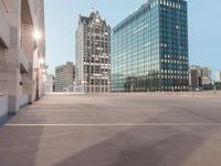Milwaukee's downtown skyline at dawn. The cityscape showcases high-rise buildings and skyscrapers illuminated by the artificial lights of the urban area. A dark parking lot and open spaces add to the metropolitan atmosphere in Wisconsin.