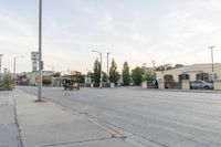 A concrete street in the city of Milwaukee, Wisconsin. The dawn sky adds a touch of color to the suburban landscape. Cars, trucks, and people populate the busy urban road.