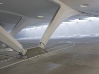 A man rides a skateboard in a parking garage in Milwaukee, Wisconsin. The modern concrete architecture and futuristic design create a unique urban space. The slant roof adds an interesting structural element to the open space.