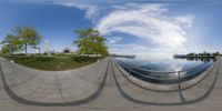 A fisheye lens captures the reflection of a skateboarder on a ramp next to a lake, surrounded by trees. The urban design of Milwaukee, Wisconsin blends seamlessly with the natural environment.