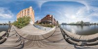 a fish eye photo of a boardwalk in a city by the water, with buildings behind it