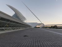 A stunning view of Milwaukee, Wisconsin at dawn. The modern architecture and straight road lines create a futuristic and urban atmosphere. The cable-stayed bridge and stadium stand out against the clear sky, while artificial lights illuminate the city below.