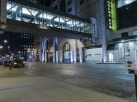 A dark urban street in downtown Milwaukee, Wisconsin. Tall buildings and street lights illuminate the concrete road and sidewalks. Reflections of artificial light create a metropolitan atmosphere.