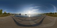 a panorama fish eye view shows two boats at a marina bay and the sun setting