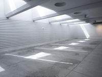 A futuristic parking garage in Milwaukee, Wisconsin. The white walls and modern architecture create a sleek and open space. Sunlight streams through the holes in the concrete, illuminating the structure.
