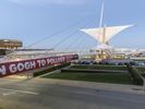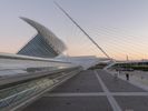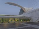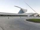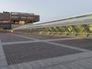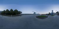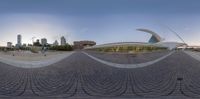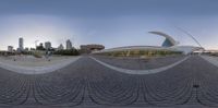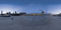 A futuristic architecture in Milwaukee, Wisconsin. The open walkway provides a straight down view of the city skyline. The reflection from a fish eye lens adds a unique perspective to the scene.