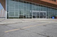 This is an image of a modern office building in the business district of Toronto, Ontario, Canada. The building's facade is made of glass and metal, with a sleek and contemporary design. The clear sky and concrete road surface create a bright and clean urban atmosphere. The building serves as the headquarters for various businesses, with shops and storefronts on the ground floor. The surrounding area includes public spaces and parking lots. This photo represents the dynamic and bustling urban environment of Toronto.