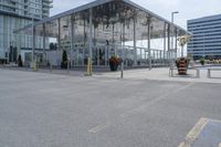 This is an image of a modern office building in the business district of Toronto, Ontario, Canada. The building features a sleek facade with lines and a mix of materials including concrete and glass. The surrounding urban landscape includes roads, parking lots, and public spaces. The image showcases the modern architecture and urban design of the city, with its bustling business and commercial activities. This photo represents a typical day in the busy city of Toronto.