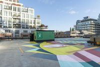 This is an image of a modern condominium building in Toronto, Canada. The building's facade showcases a mix of modern architecture and urban design. The surrounding open spaces feature a clean concrete surface and asphalt road. The clear sky above highlights the vibrant colors of the graffiti art on the walls. This photo captures the essence of city life in Toronto's art district.