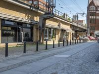 A view of a bustling street in Berlin, Germany. The city's iconic architecture is showcased through the mix of buildings and storefronts. The clear sky highlights the urban landscape, while a train station adds to the vibrant atmosphere in this European city.