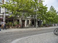 This image captures the essence of city life in Berlin, Germany. The classic architecture of the residential buildings and mixed-use properties line the cobblestone roads. People are seen walking, cycling, and enjoying the public spaces, including cafes and restaurants. The trees and road surface create a pleasant urban environment. This photo showcases the vibrant urban design and transport options available in this European city. It represents a typical day in Berlin, where residents and visitors can eat out and explore the city's diverse neighborhoods.