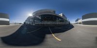 a fish eye lens image of an airport with the sun shining on the ground and a few large buildings