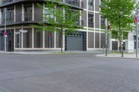 A modern apartment building in Berlin's residential area. The empty street and trees give a serene atmosphere to the urban setting. The cloudy day adds a touch of mystery to the modern European architecture.