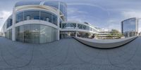 A 360-view of a modern architectural courtyard in downtown Milwaukee, Wisconsin. The courtyard features two buildings with glass facades and a central staircase. The urban design and straight line of the road create a dynamic atmosphere.