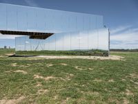 a large mirror is sitting in a grassy field by some rocks and the sky with white clouds
