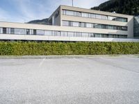 This is an image of a modern building in Austria. The clean white architecture stands out against the clear sky and is surrounded by large bushes. The surface in front of the building is an asphalt parking lot. The landscape of the surrounding mountains and nature adds to the elegance of the scene. This photo captures the beauty of modern architecture in a natural setting.