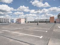 An empty parking lot in Berlin with modern architecture buildings in the background. Streetlights illuminate the urban space beneath a clear sky. The urban design showcases the city's vibrant and dynamic atmosphere.