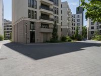 This image captures the essence of city life in Berlin, Germany. The modern architecture of high-rise condominiums is reflected in the shadow cast on the cobblestone road. Clear skies above provide a backdrop to the urban design and open spaces. The residential areas blend seamlessly with the cityscape, creating a harmonious blend of old and new. The shadow intentionally added to the color of the image adds depth and texture. This photo represents the vibrant energy and architectural beauty of Berlin.