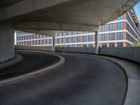 Urban architecture in Berlin featuring modern design elements. A curved road leads to a parking deck with a cloud-dotted sky. The city's contemporary urban design on display in Europe.