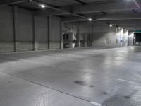This is an image of a dark city street in Berlin, Germany. The modern architecture and urban design are evident in the concrete streets and parking deck. The open space of the street contrasts with the surrounding buildings. The photo was taken at night, giving it a mysterious atmosphere. This image represents the urban landscape and modern infrastructure of Berlin.